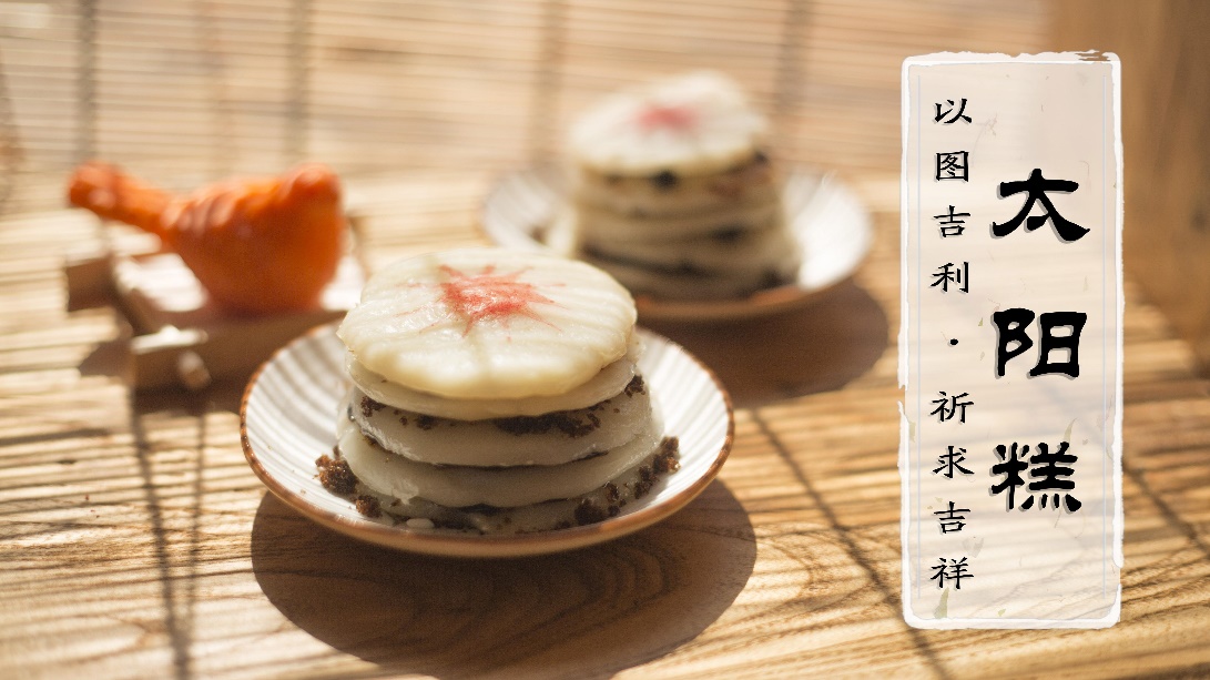 太陽糕,又稱太陽雞糕,是二月二的節令小食,《燕京歲時記》道:“二月初一日,市人以米面團成小餅,五枚一層,上貫以寸余小雞,謂之‘太陽糕’,都人祭日者買而供之,三五具不等。”